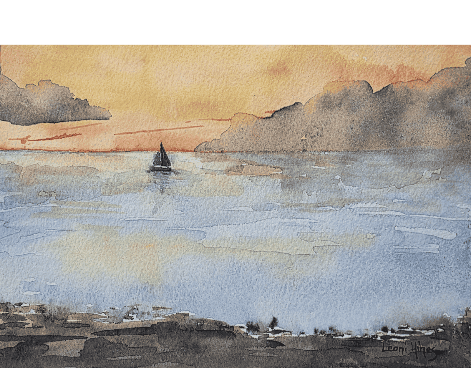 Set sail into serenity with Afternoon Sail, an original watercolour painting. This tranquil seascape captures the golden glow of a late-day sunset, with warm hues of orange and yellow reflecting across gentle ocean waves. A lone sailboat drifts peacefully toward the horizon, framed by distant mountains and a rocky shoreline. Painted with soft brushwork and atmospheric light, this signed piece evokes calm, solitude, and the quiet magic of coastal life. Ideal for collectors of nautical art, ocean-inspired decor, or lovers of watercolor landscapes.