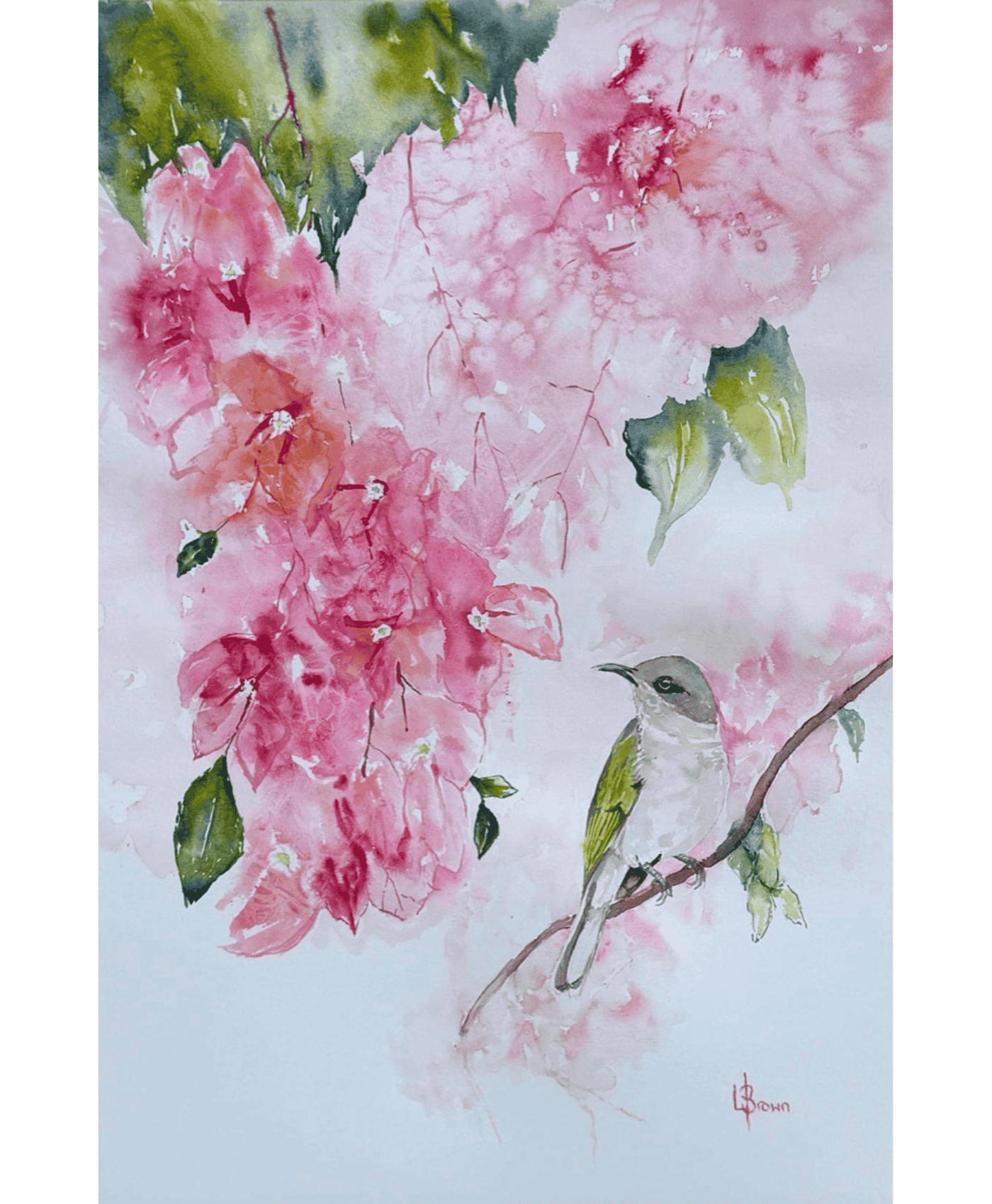Painted from life - a stem of Bougainvillea with its papery blossoms in luscious pinks and salmon. The addition of the Brown Honeyeater completes the story.