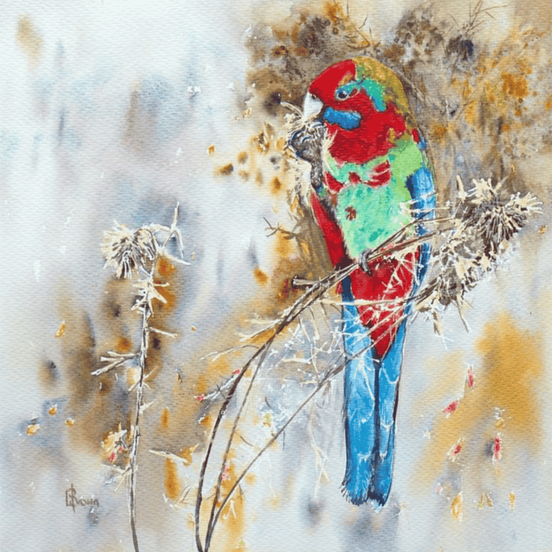 Granulating pigments and a rough surface paper have been used to create the texture for this work of a young Crimson rosella enjoying a prickly lunch.