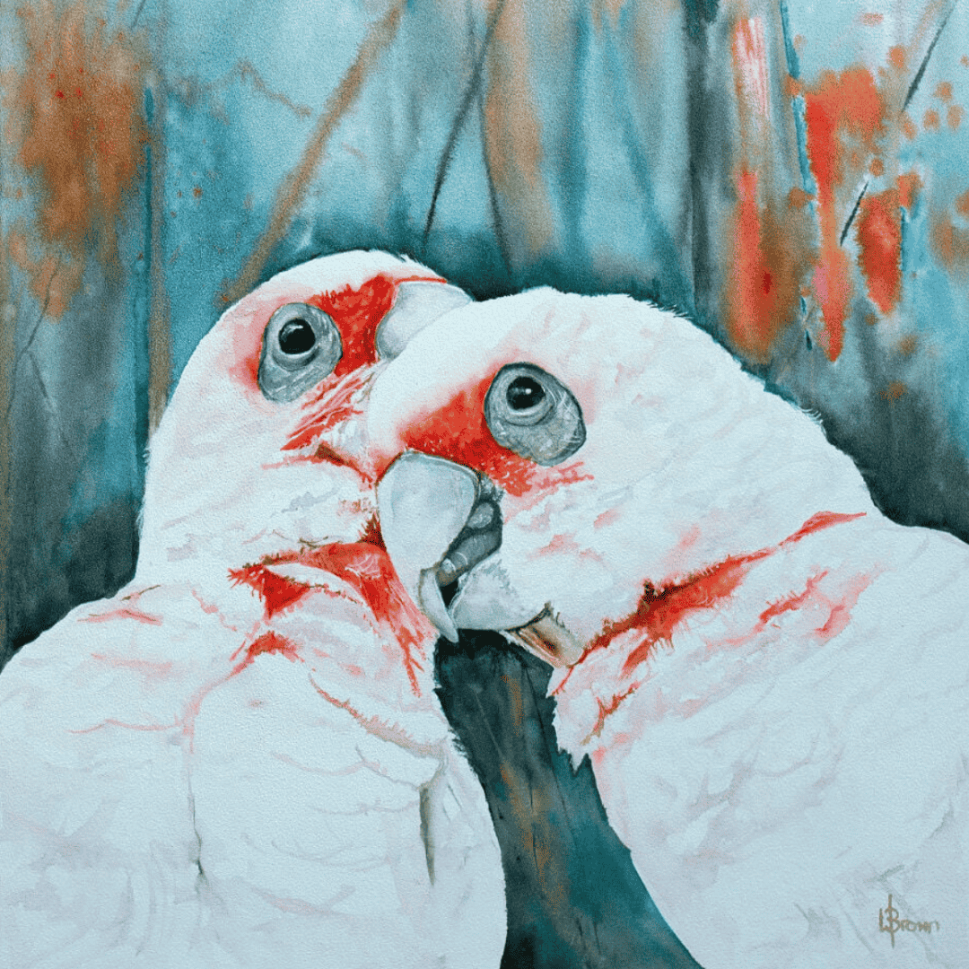 Long billed Corella painted in watercolour on a specially prepared wooden cradled panel requires a slightly different pigment application to painting on paper, which is playful and exciting.