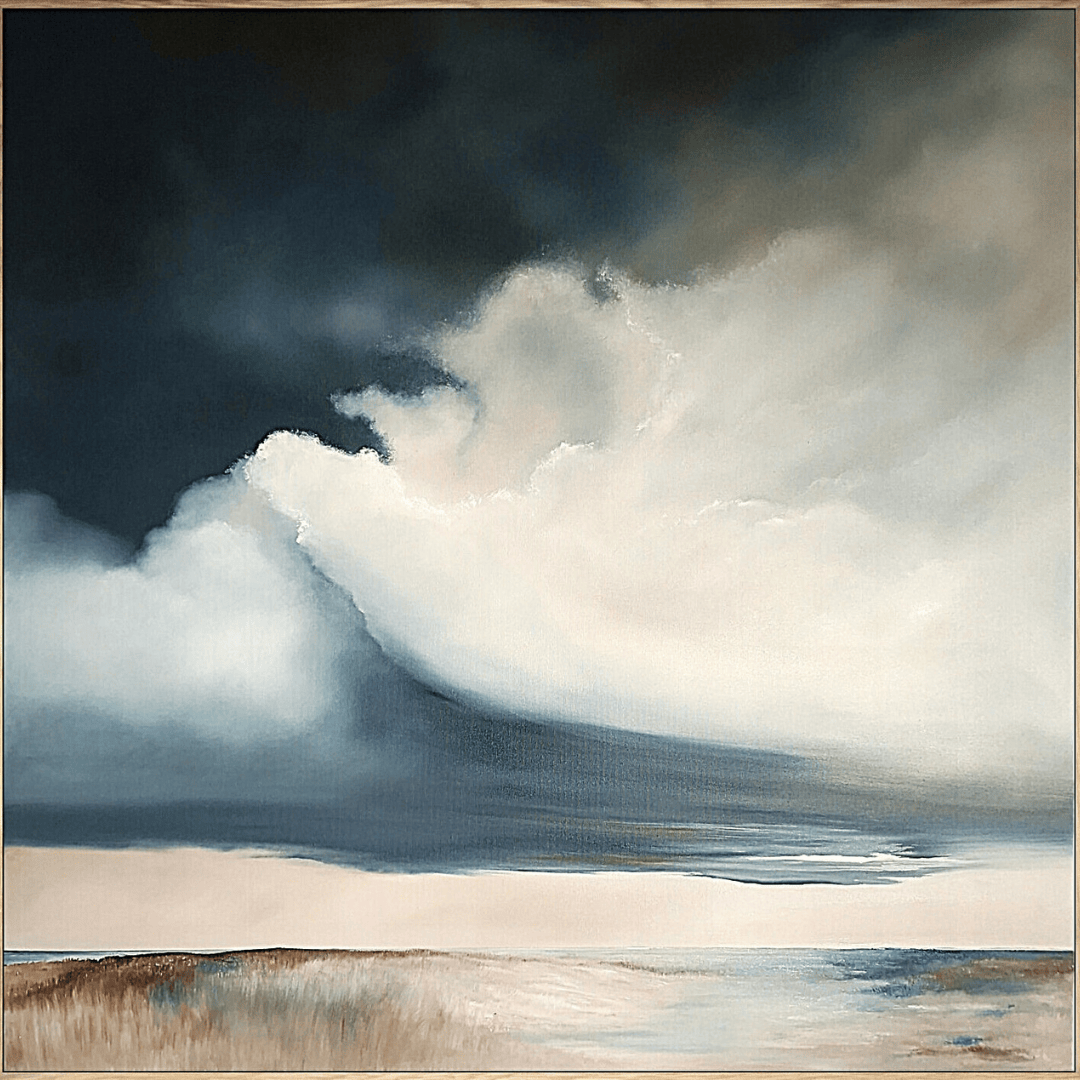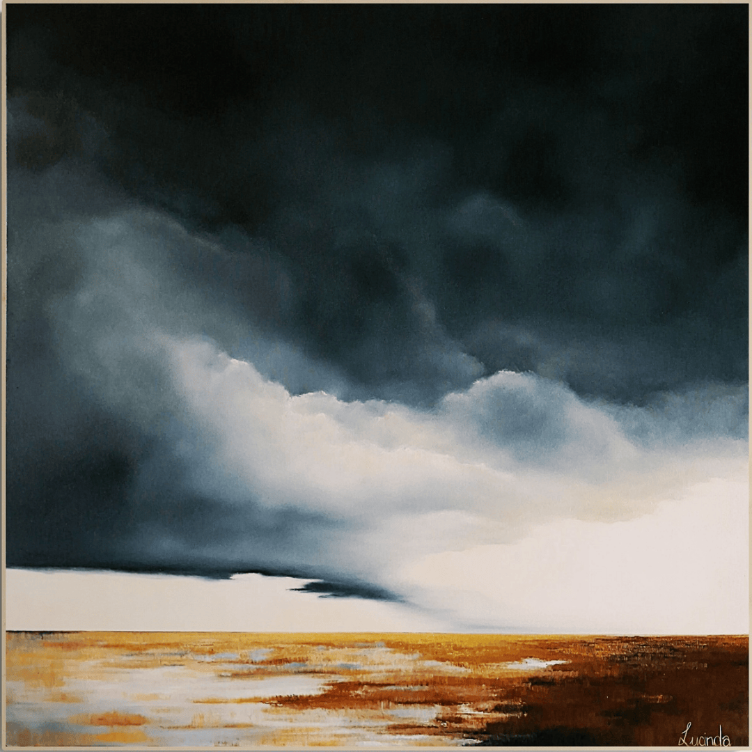 The track has been travelled so many times it no longer leads anywhere in particular. It simply wanders with the land, folding into the gentle rise of the grasses and disappearing again as the sky presses lower. On this day the air held still, as if the world was thinking. A storm moved in slowly, gathering its colour in the distance, but the land didn’t rush to meet it. It waited, listening to the soft wind through the dry stems, letting the moment stretch. There was nothing to do but walk, breathe, and watch the weather drift towards you. Some days the sky feels close enough to touch; other days it feels like it might swallow the horizon whole. This painting lives in that in-between place, where time pauses and the road becomes the only certain thing ahead.