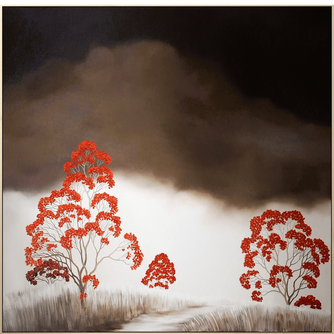 Beneath the Heavy Sky captures an atmosphere that is at once haunting and beautiful, immersing the viewer in a landscape where contrasts dominate. At first glance, the composition is striking: a broad expanse of dark, almost suffocating clouds spreads across the upper half of the canvas, descending heavily upon the land below. Yet beneath this brooding sky, bursts of vibrant red foliage emerge, painted with precision and vividness, standing out against the muted background. The balance between darkness and brightness, despair and vitality, creates a narrative that feels deeply human and timeless.