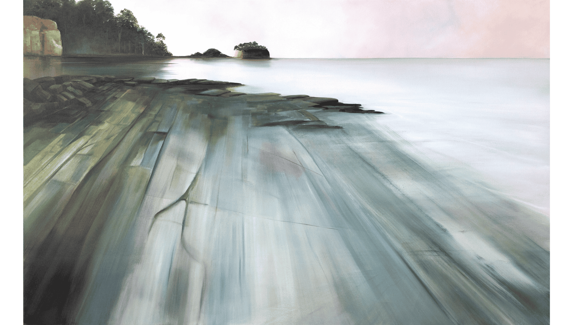 Silent Runes is an atmospheric oil painting inspired by the way tide and weather leave their marks on the landscape. Shallow water moving across rock holds traces of pattern and rhythm, shaped slowly by repetition rather than force. These marks are neither decorative nor fixed, but the result of ongoing movement, erosion and return.