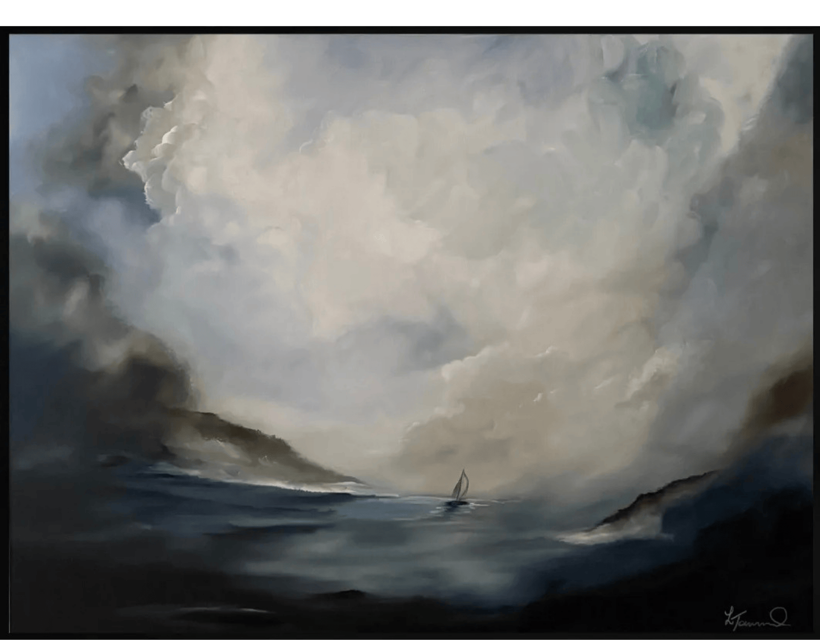 DRIFTING is a stunning atmospheric artwork that will draw you in and hold your attention. This beautiful artwork captures the raw beauty of nature. The ever changing colours of the cloudy sky, drifting in the distance and surrounding the headland. The sea is rough and deep. The one lone sailboat drifts out into the eerie mist, not knowing what is far ahead of him. This feels like the way we navigate our lives, drifting along, sometimes into the unknown.