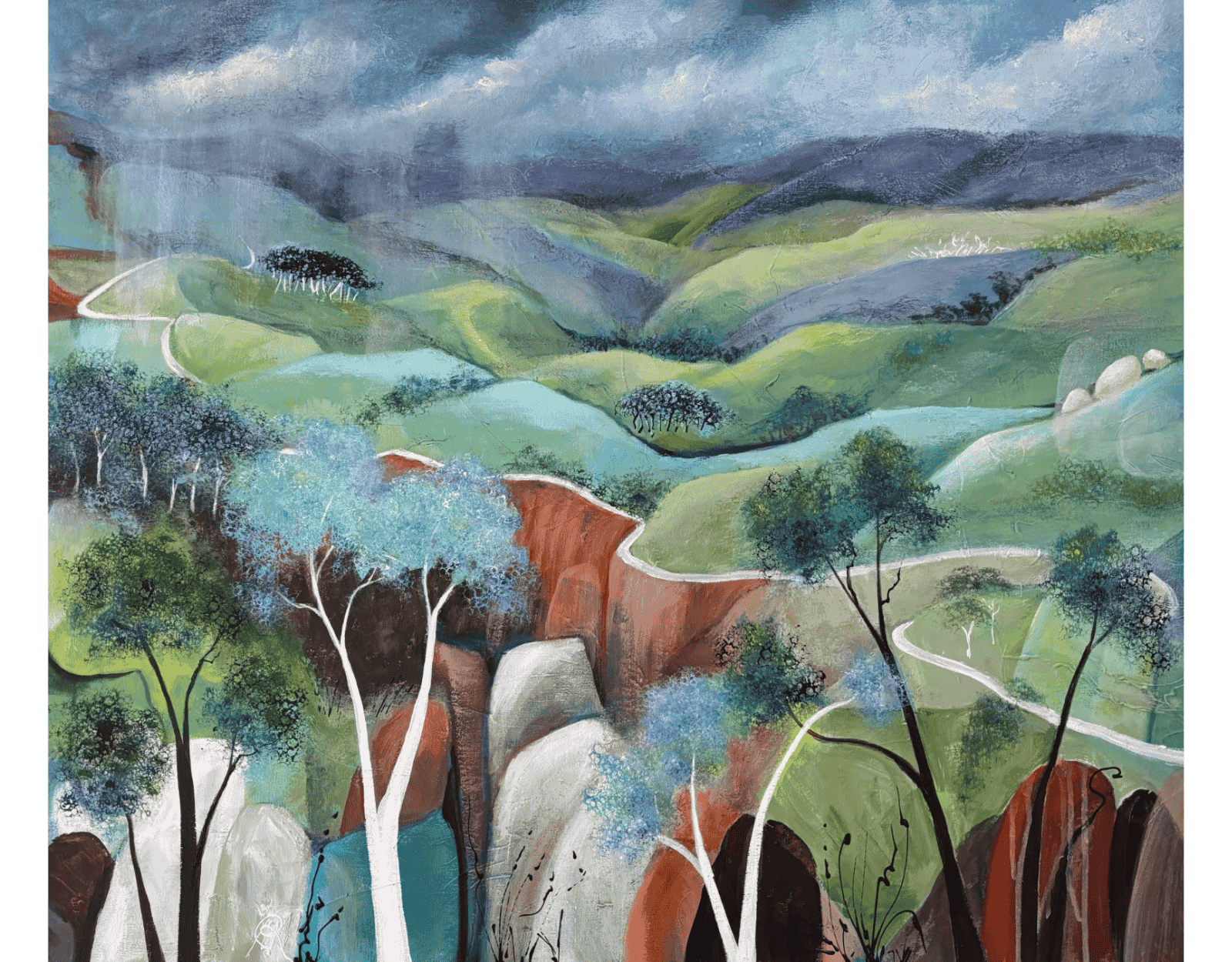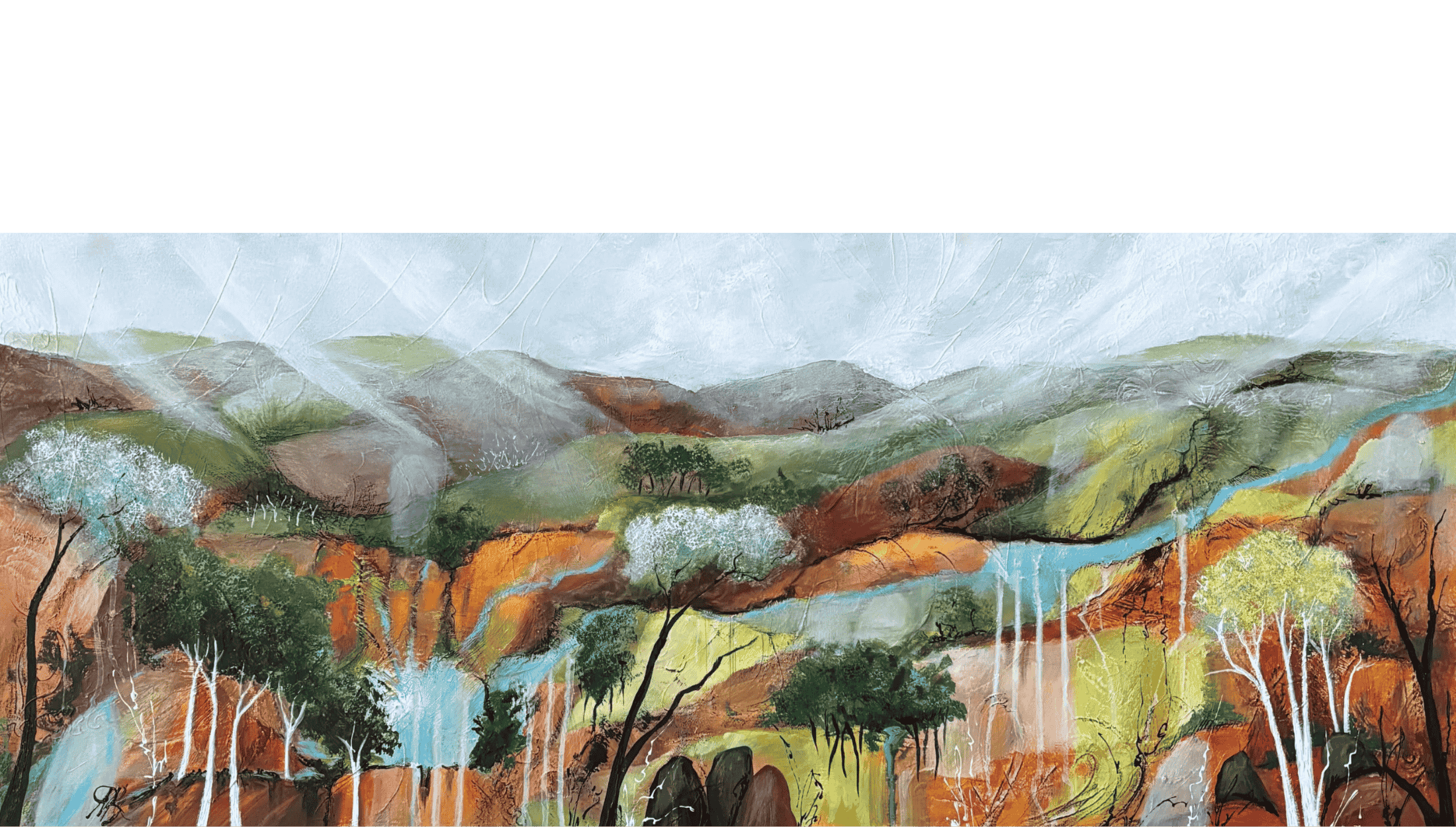 Abstract landscapes are the paintings I love to work with because of the amazing depth and breadth of our beautiful land. Sky, Land, Water arose from a collection of photos taken years ago in high country Victoria. Pulling together sky, land and aspects of the waterways, I created an abstract expression of our country. The presence of ghostly rocks is a reminder of the evolving nature of our land.