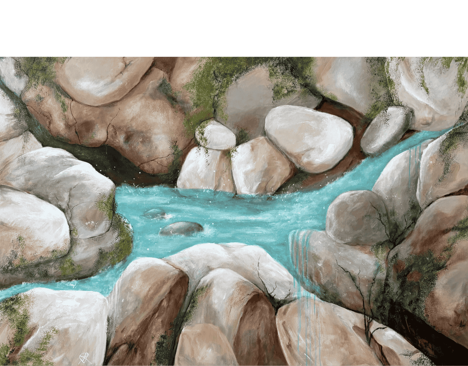 The Mossman Gorge typifies much of the northern Australian land as it was millions of years ago. The river and the gorge are alive with the beauty and energy of an environment that we are in danger of losing. This painting is a semi abstract view of my impressions of the beautiful clear waters and monolithic rocks forming the ebb and flow of the river. It is also an expression of how I feel about this area of our country.