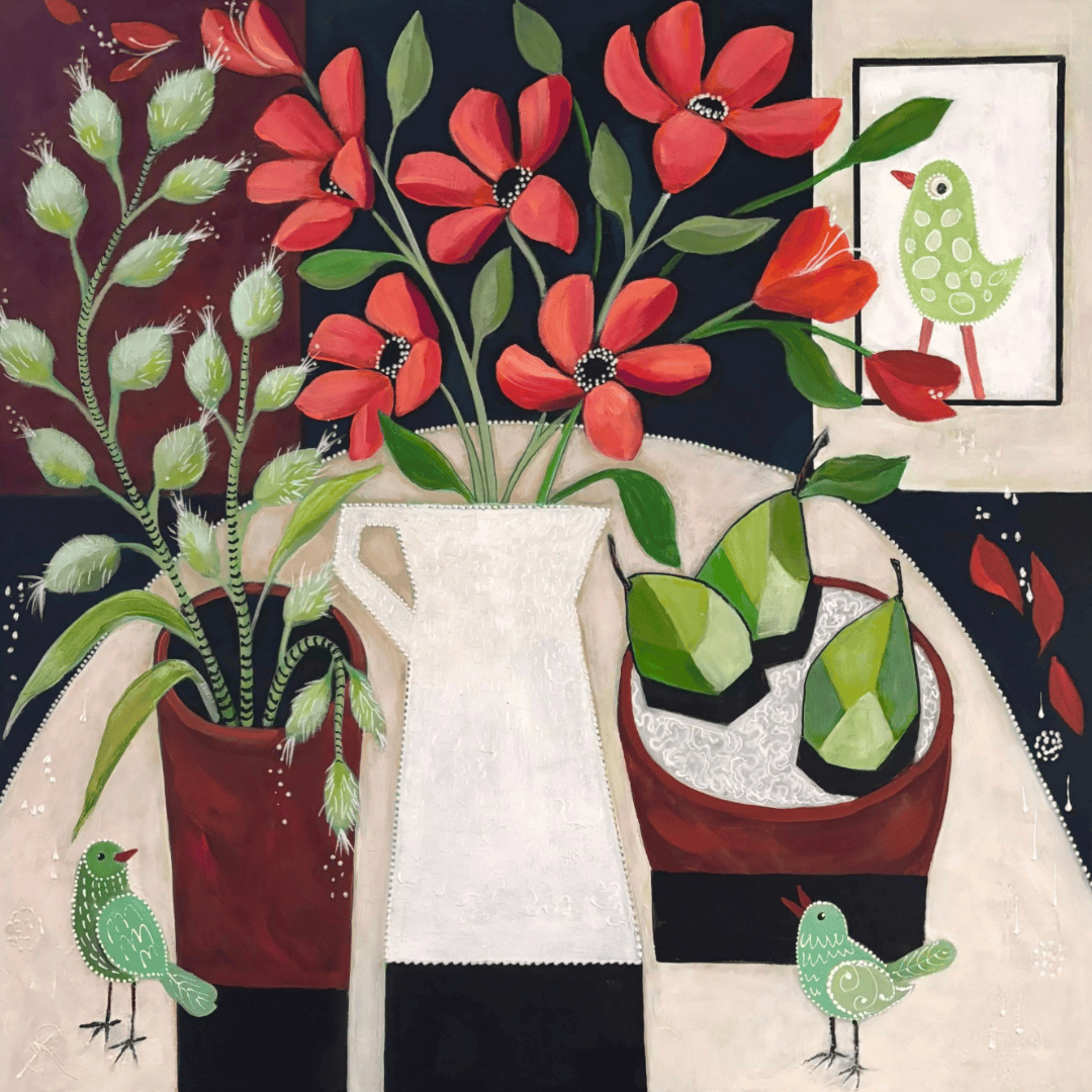 The painting is another in the whimsical still life series. Watching the birds in the garden fossicking for food and just loving the fruits was the inspiration for this painting. The painting is impressionism in style, with a little abstraction. The colours are bright and this piece is the perfect size for any room in the home.