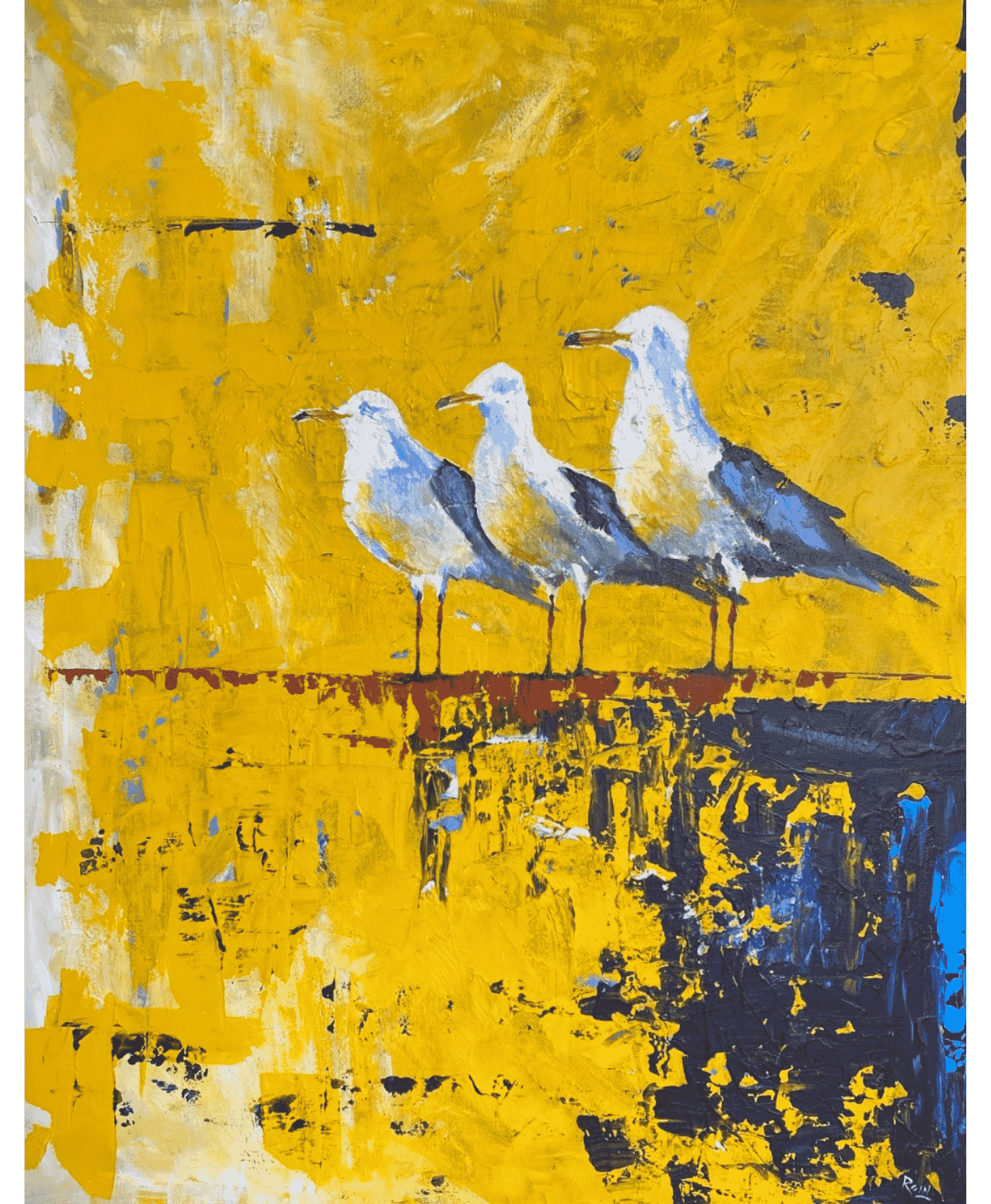 Three seagulls stand in quiet formation against a vivid field of textured yellow, their white feathers catching hints of blue, grey and reflected light. Beneath their perch, abstract strokes of deep navy, ochre and red break apart like weathered paint on an old jetty, creating a sense of movement and coastal grit.