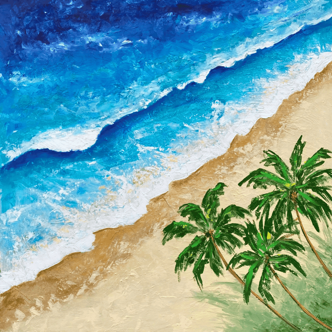 From a playful, top‑down angle, waves arc across the canvas in thick swells, tumbling onto a sun‑baked shore. Leaning, wind‑tossed palms echo the diagonal sweep, giving the scene its signature “tilt” and a dynamic sense of movement.