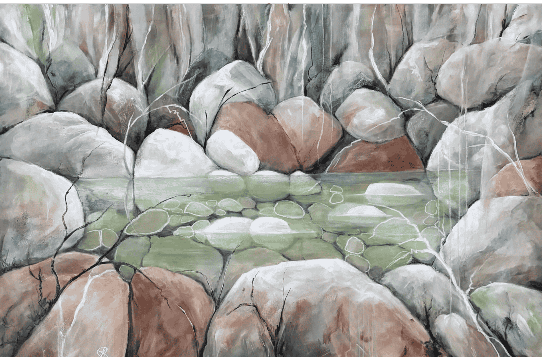 The rainforest typifies much of the northern Australian land as it was millions of years ago. The river and the gorge are alive with the beauty and energy of an environment that we are in danger of losing. This painting is a semi abstract view of my impressions of the beautiful clear waters and monolithic rocks forming the ebb and flow of the river. It is also an expression of how I feel about this area of our country.