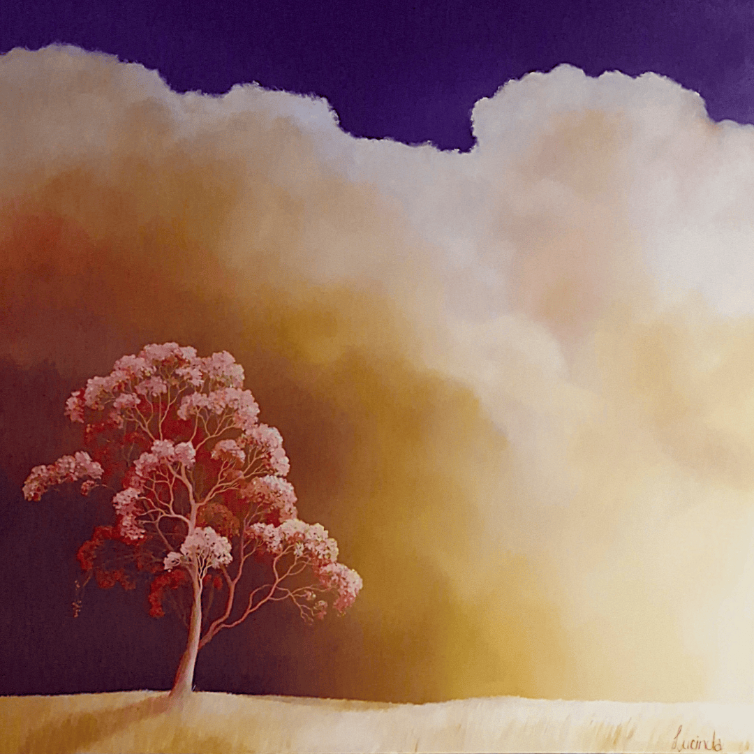 Held in the Glow is an original oil painting capturing the warm intensity of a late outback sky, where light shifts into deep gold and the land holds a quiet, steady breath. A single tree stands in the heat, grounded and resilient, while soft yellow clouds gather above it. This work reflects my ongoing exploration of stillness, distance, and the quiet thresholds that happen between day and dusk. I am drawn to these moments when the landscape feels suspended, waiting, listening, and full of its own quiet power.