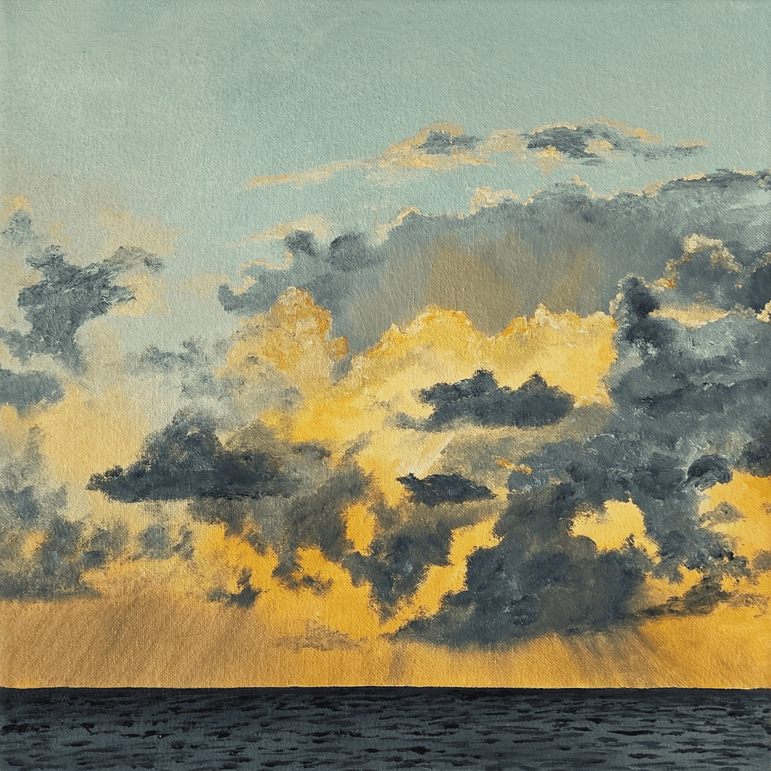 Sunset Show Down is an original painting that captures a dramatic beam of golden light cutting through late-afternoon clouds above the sea. This luminous seascape captures the moment when the sky becomes incandescent and invites quiet reflection — a scene that rewards repeated viewing and brings warmth to any interior. Painted using layered glazing and textured brushwork, Sunset Show Down balances bright highlights with deep oceanic tones to create a powerful yet contemplative atmosphere.