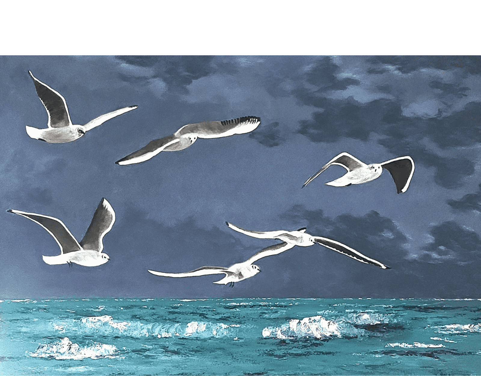 There comes a moment after being away when you return to your easel and suddenly understand what you've been missing - not just the act of painting, but the profound connection between your soul and the canvas. This painting emerged from that first breath back in the studio, when the memory of soaring gulls over endless ocean became a meditation on liberation itself. Each bird represents a different aspect of freedom - some gliding with certainty, others dancing on the wind, all moving through space with an effortless grace that speaks to our deepest longing to transcend earthly bounds.