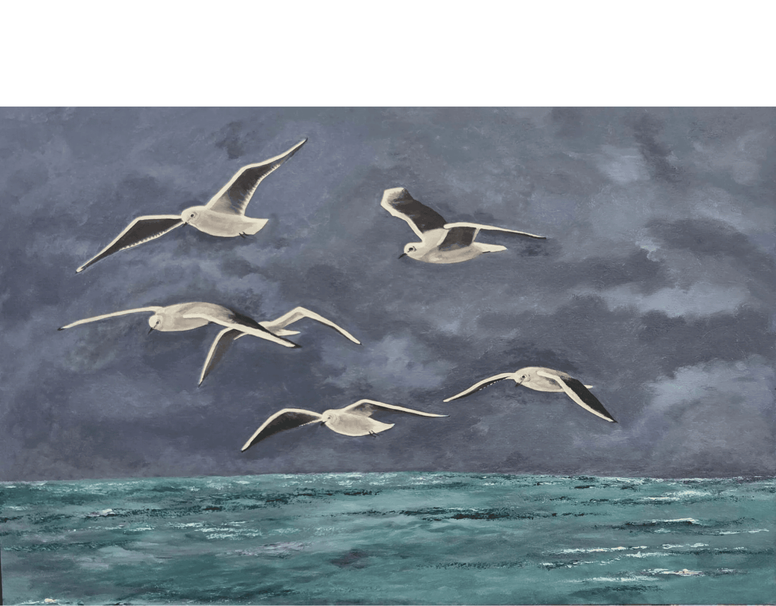 Passion is not a destination but a journey marked by movement, momentum, and the courage to keep flying even when the sky darkens. This painting celebrates that relentless forward motion - the way our deepest passions propel us onward, regardless of conditions, carrying us across turbulent seas and through stormy skies. Each bird follows its own trajectory yet moves in harmony with the flock, demonstrating that passion shared amplifies rather than diminishes, and that we can honour our individual path while remaining connected to something larger.