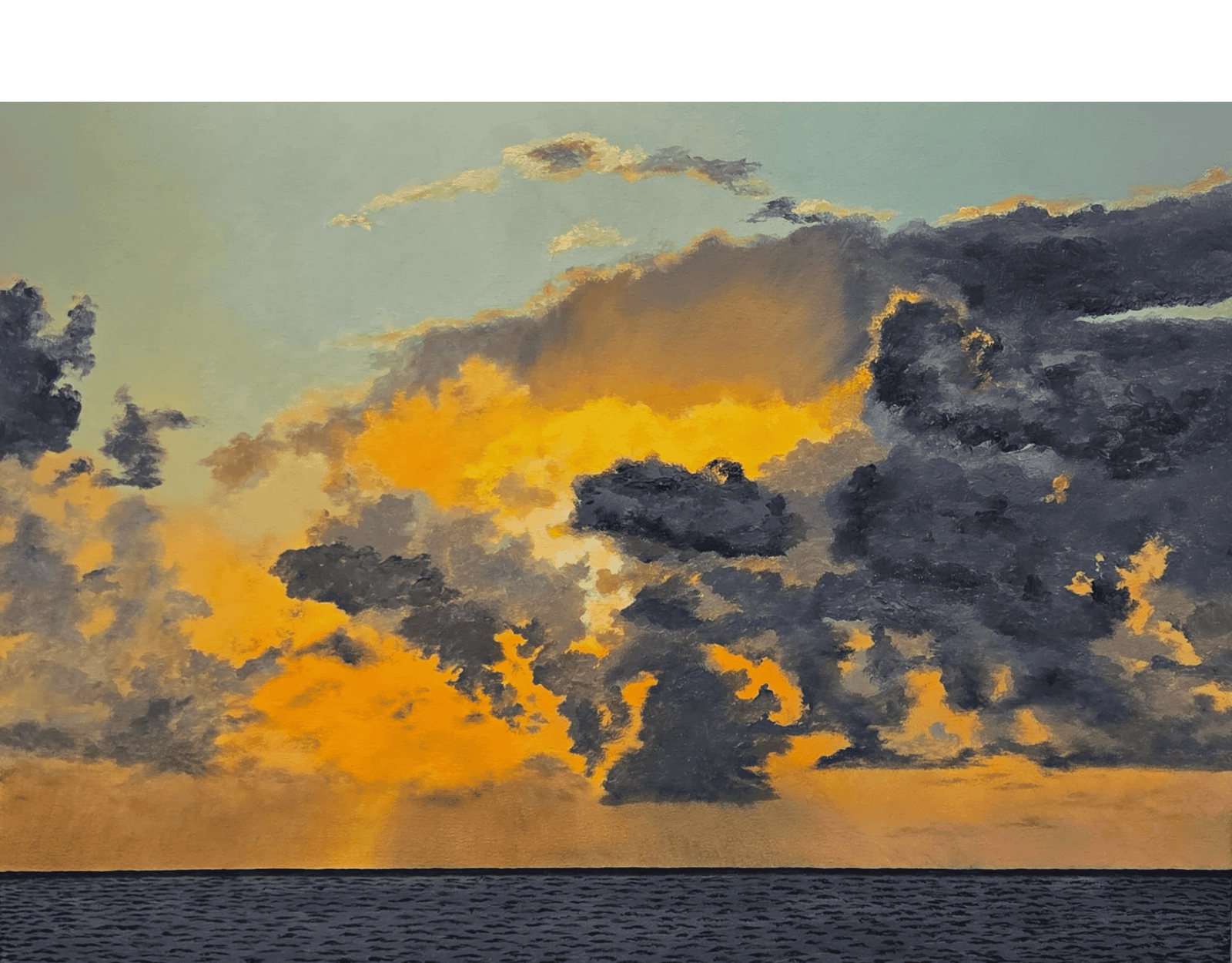 Laudation captures the grandeur of the sky in vivid celebration. Dramatic storm clouds edged with brilliant gold and amber light contrast against heavy charcoal-grey masses, while a radiant glow pulls the eye toward the horizon. This Laudation piece, painted in rich oils, showcases expert handling of atmospheric effects—from subtle luminous tones, to complex cloud layering that shifts and moves across the canvas with life-like depth. The calm water below balances the drama above, reflecting warm golden light and offering serenity within the composition.