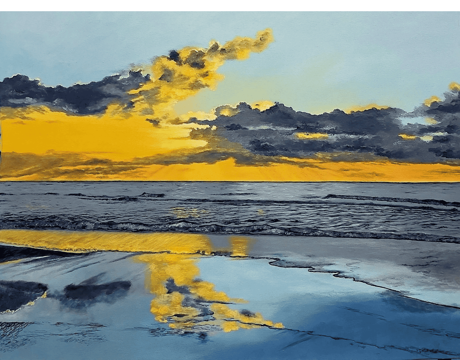 I was mesmerised as I painted this piece, watching the clouds seem to ascend upward into the heavens, drawn toward the Creator in streams of golden light, only to cascade back down in radiant glory. It became a visual prayer about the eternal conversation between earth and heaven, that sacred exchange where our praise rises up and His glory shines back down. The way those luminous rays reflect in the wet sand creates a perfect circle - what ascends must descend, what we offer up returns multiplied in beauty.