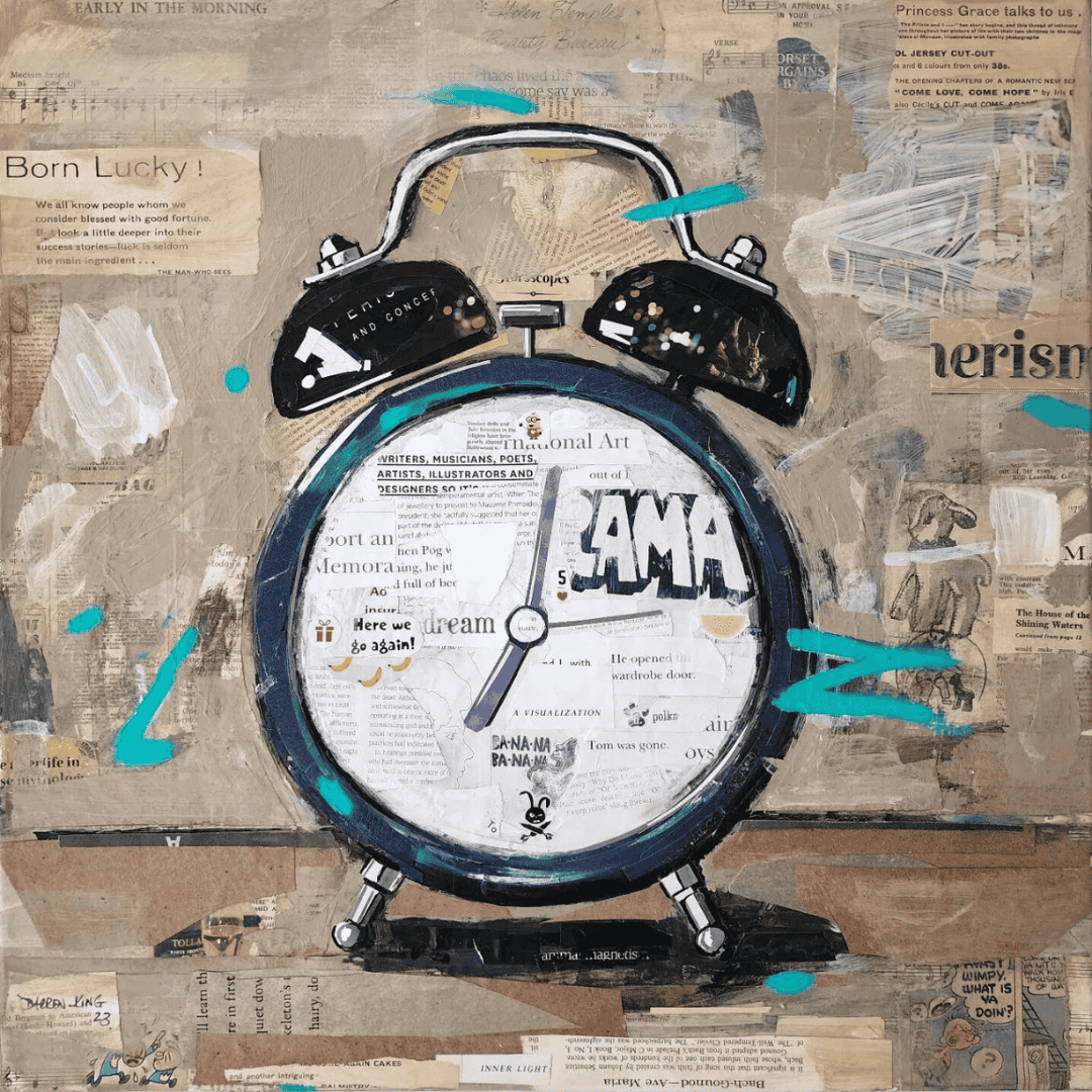 The collaged paper elements have been taken from discarded books, junk mail, packaging, maps and vintage magazines.