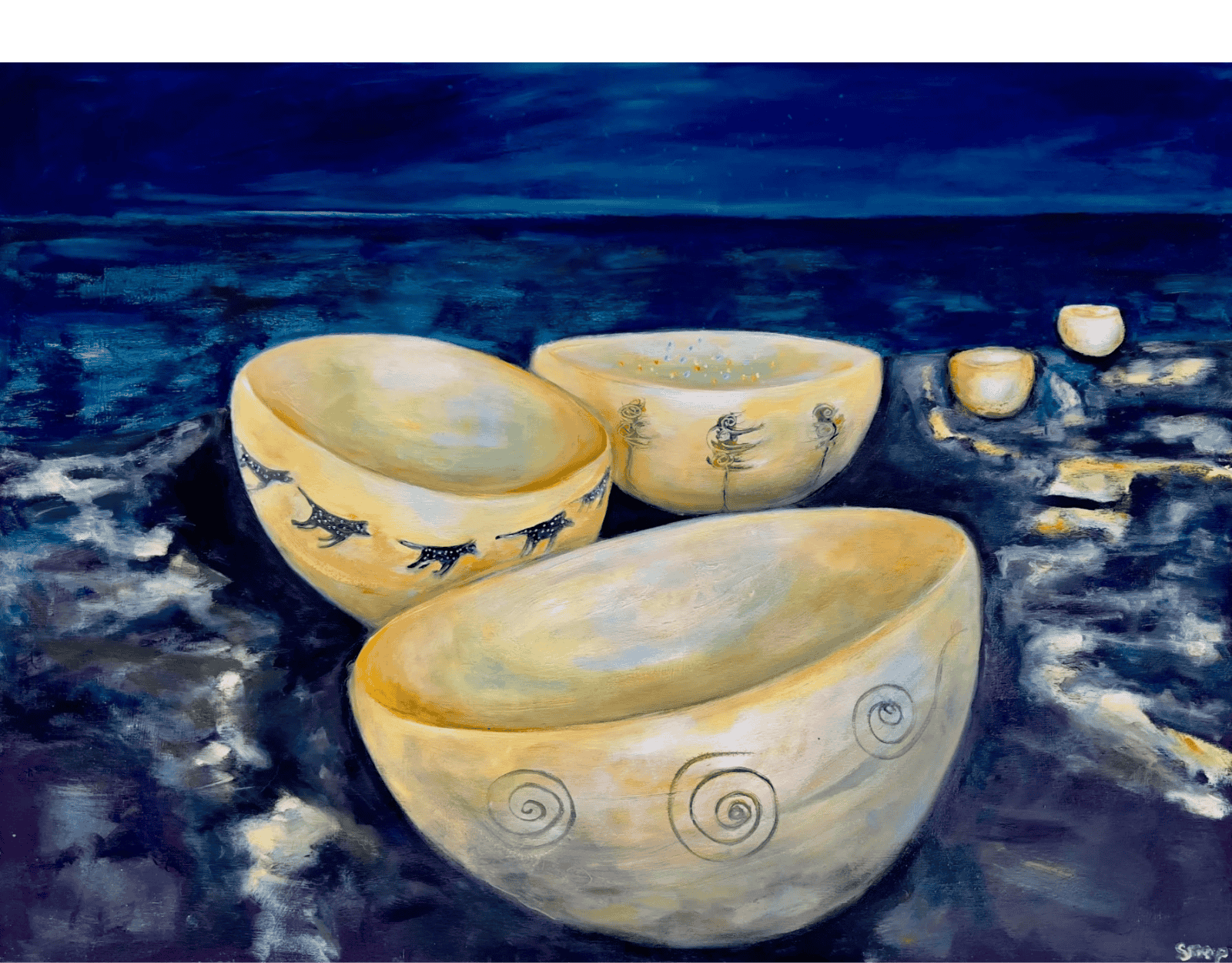 Making the real surreal is my speciality. Here are five of my own wheel thrown bowls sitting on the rocks above the sea. I photographed them like this and then painted a surreal version. Bowls are such symbolic objects and can be used for so many purposes. Their shape always suggests a rising energy to me, and in this case, I see wishes rising for peace, love and harmony, and other good things.