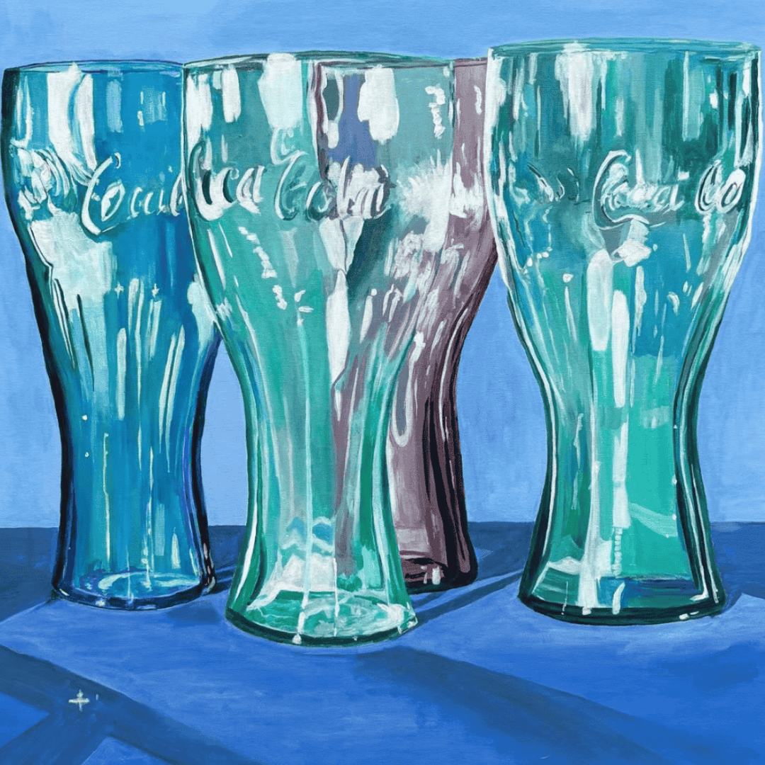 Tinted Temptations feels less like a still life and more like a conversation with memory. Four glasses—each tinted in turquoise, purple, green and light blue—line up like old friends, familiar yet freshly radiant. Their glossy reflections catch the light in ways that remind us of shared moments: the clink of glass at a gathering, the cool sip on a summer afternoon, the nostalgia of a brand woven into everyday life. This piece is perfect for anyone who treasures the blend of pop culture and personal memory, and who delights in art that feels both familiar and fresh.