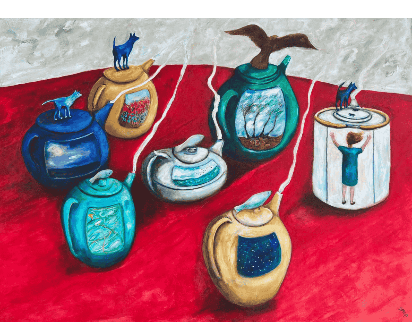 Teapots and tea always evoke comfort for me. I am Scottish, after all! I have a massive collection of them. When I make them, I like to take symbols from other paintings - dogs of course, but also birds and fish, to use as knobs. The images on the side are windows into little scenes from my day to day life. Swimming, walking, watching nature, the world.