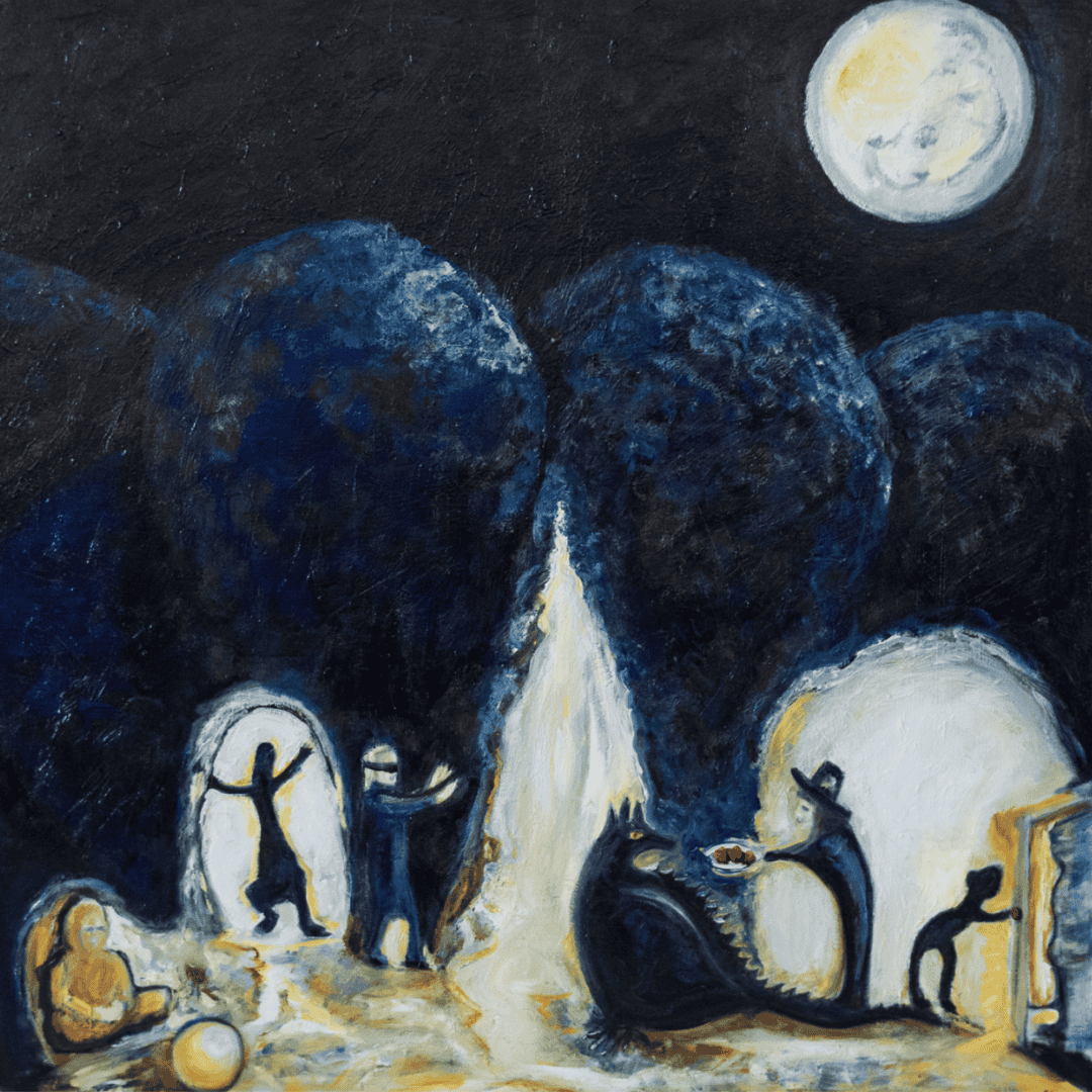 It's a small, colourful oil painting full of mystery and story. Feel free to let your imagination create your own.